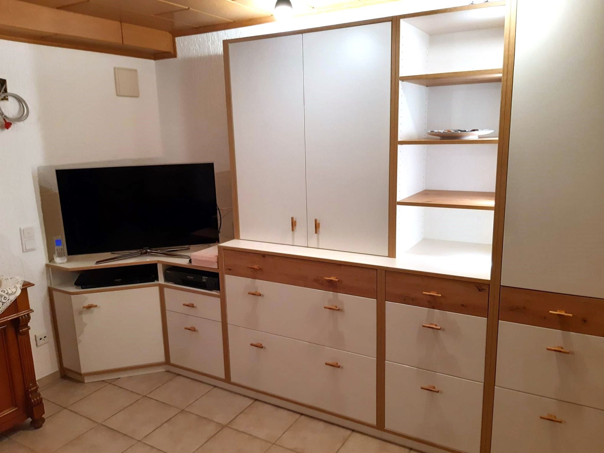 Wohnzimmerschrank Kunststoff weiß mit Kernbuche